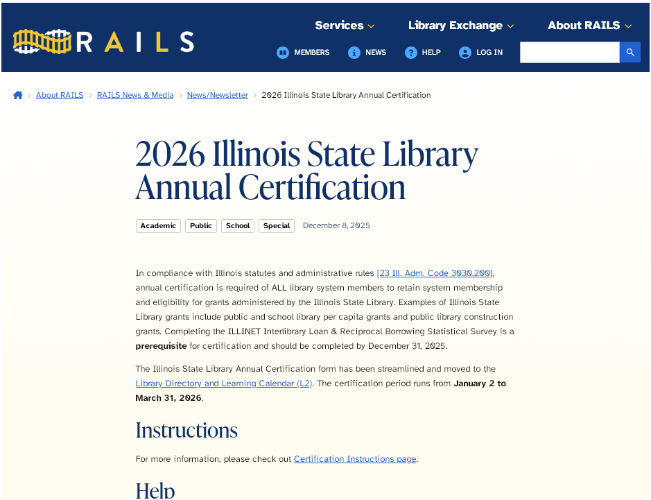 The Illinois State Library Annual Certification form has been streamlined and moved to the Library Directory and Learning Calendar (L2). The certification period runs from January 2 to March 31, 2026.